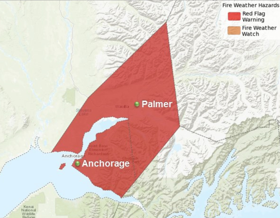 A large portion of Southcentral Alaska — including Anchorage and part of the Mat-Su — remained under a “red flag warning” through Sunday night, reflecting hot and windy weather that could fuel the rapid ignition and spread of fires. The red flag warning extended through the Copper River Basin and north of the eastern Alaska Range.